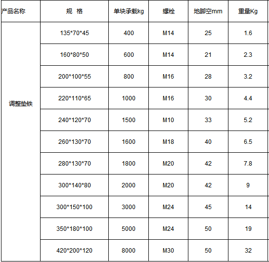用于各種設備的水平和平行調整,使設備在運轉過程中不發生震動、傾斜,_機器的良好運轉,減少機器磨損,_設備 。特點是:使用簡單、方便、快捷、可根據用戶的需要制造,